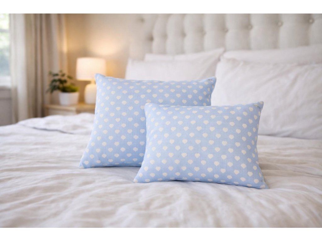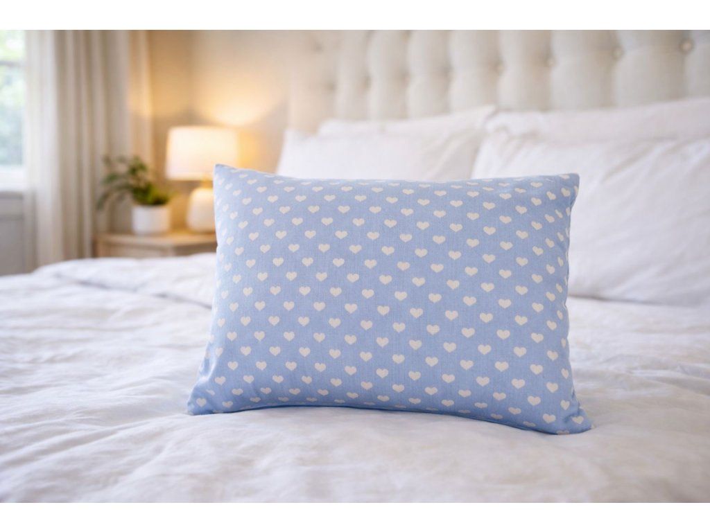 Jemný dekorativní polštářek v pastelově modré barvě s drobnými srdíčky, který dodá interiéru klidnou a útulnou atmosféru.