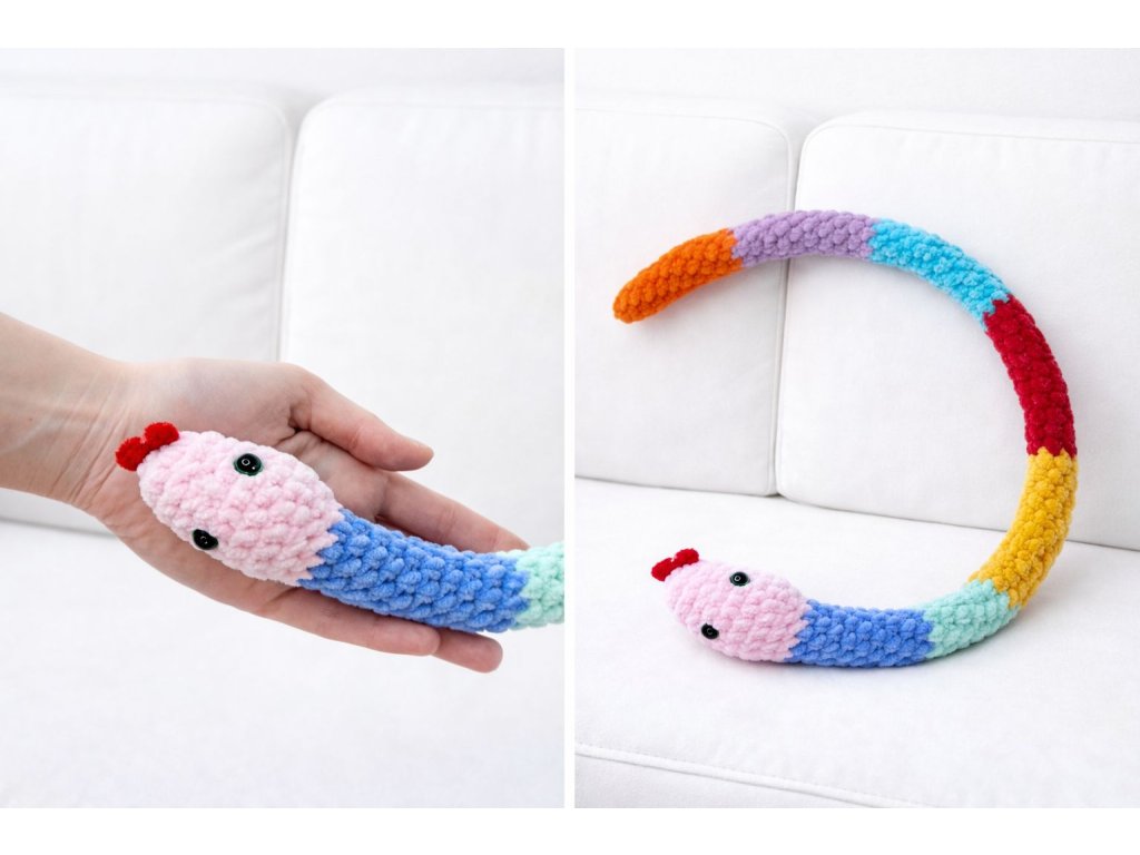 Ručně háčkovaný had je originální a měkký výrobek, který potěší malé i velké děti. Je ideální jako hračka, milý dárek k narozeninám, k svátku, k Vánocům nebo jen tak pro radost. Hodí se také jako originální dekorace do dětského pokoje, obýváku či ložnice, a děti si s ním rády hrají nebo ho používají při spinkání.