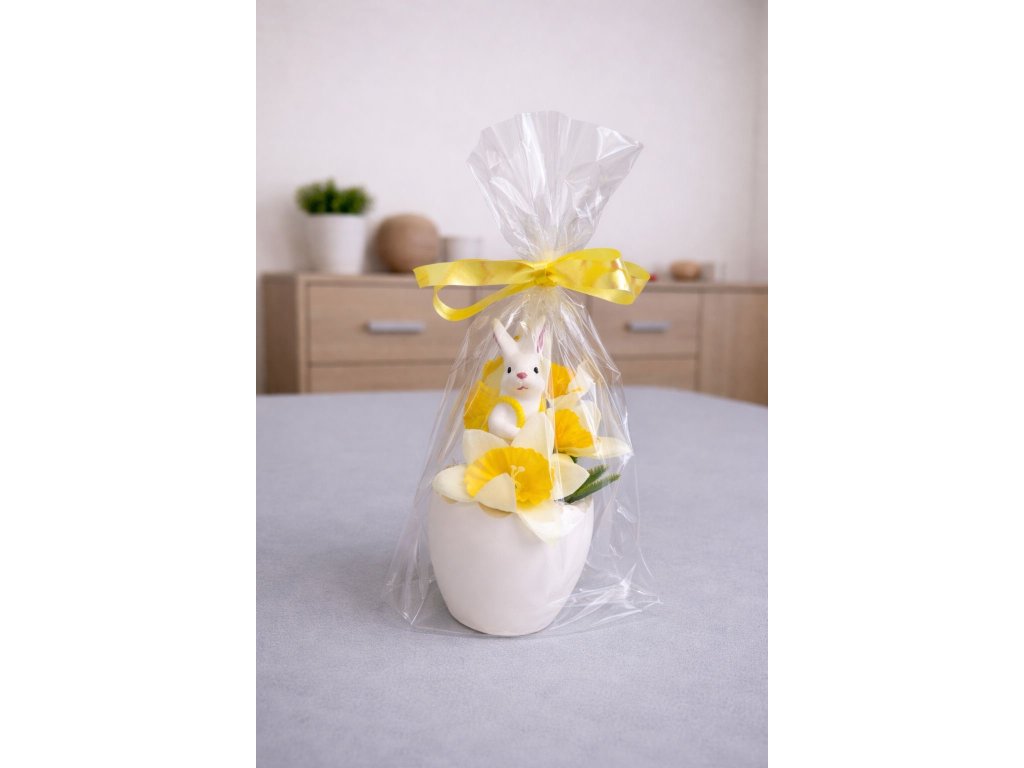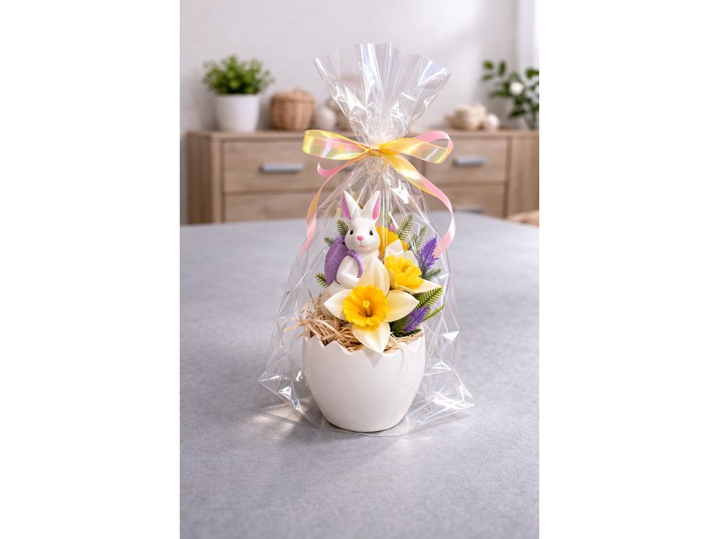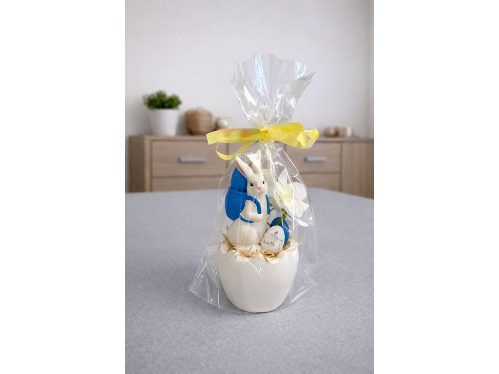 Roztomilá velikonoční dekorace se zajíčkem v modré vestě, umístěná v keramické skořápce a doplněná vajíčkem a květinou. Elegantně zabalená v celofánu se žlutou stuhou – ideální jako jarní ozdoba i milý dárek.