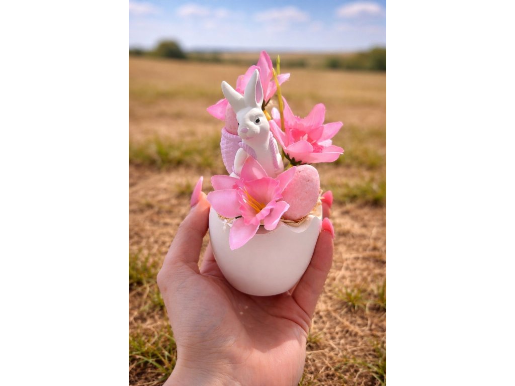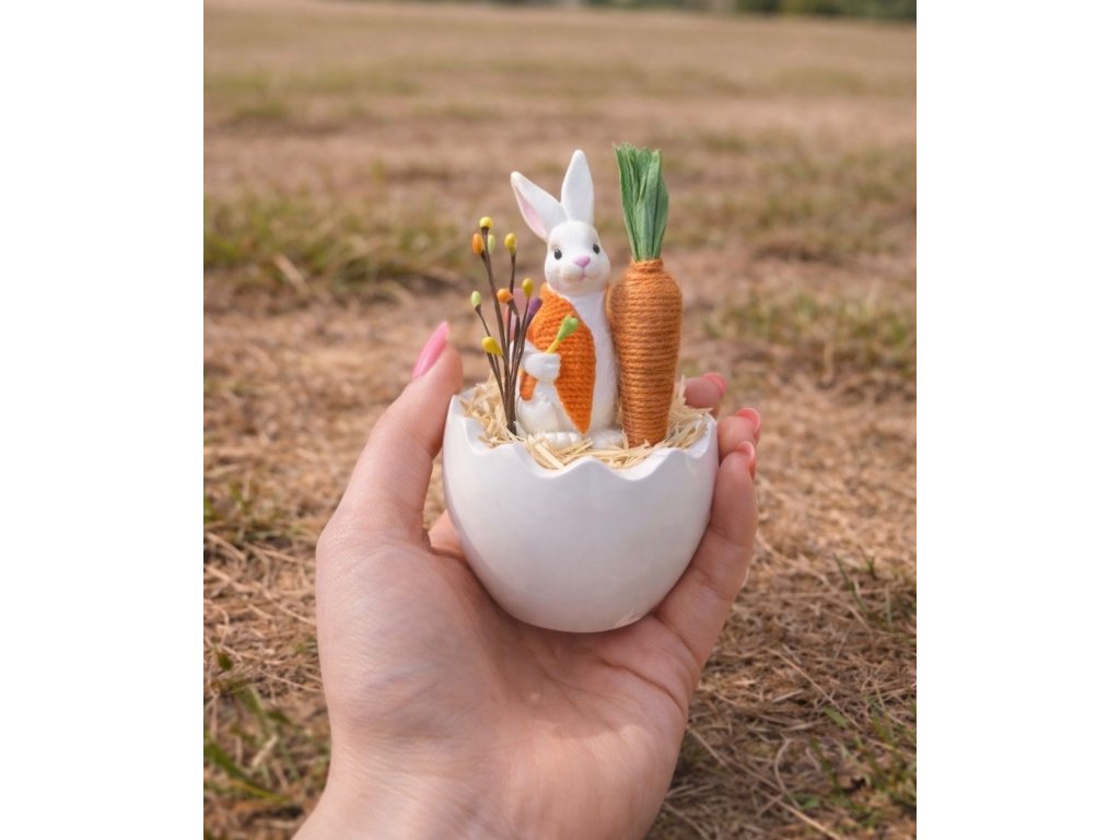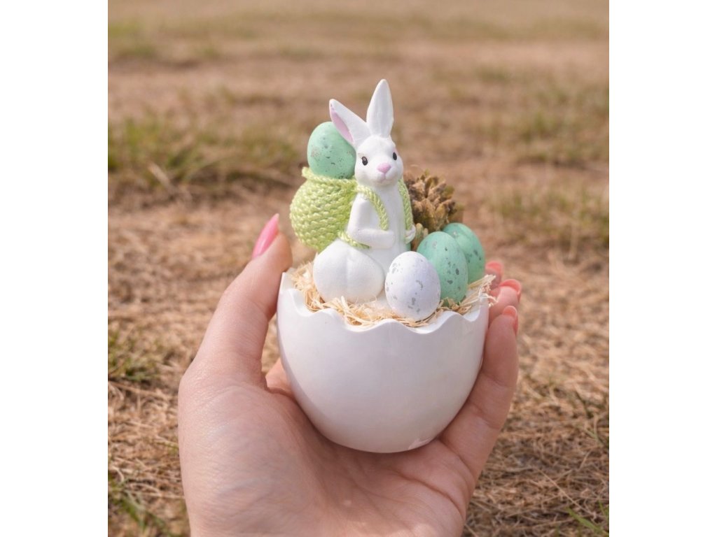 Velikonoční dekorace se zajíčkem je vkusným a originálním doplňkem, který vnese do vašeho domova svěží jarní atmosféru. Dominantou aranžmá je roztomilá figurka bílého zajíčka oblečeného do modré vesty. Zajíček je usazen v keramickém obalu ve tvaru rozbité skořápky, která symbolicky odkazuje na velikonoční tradice a probouzející se jaro.