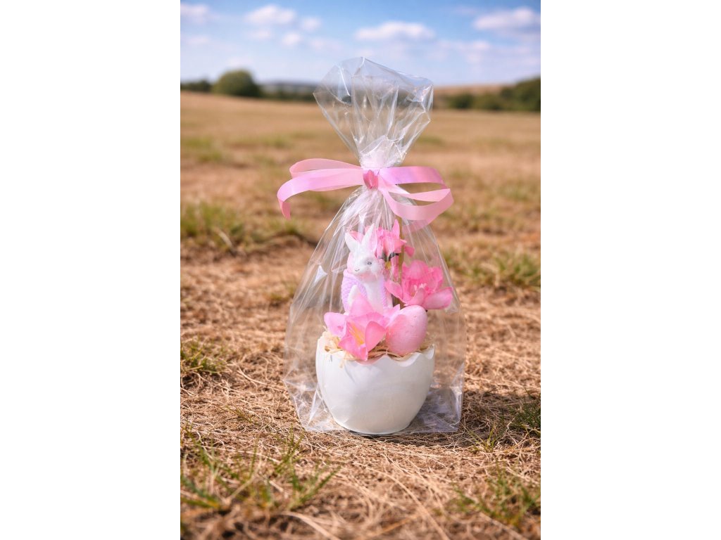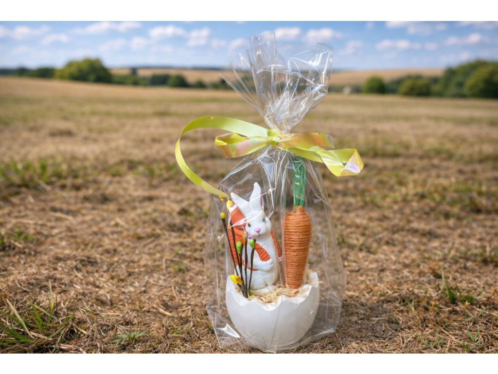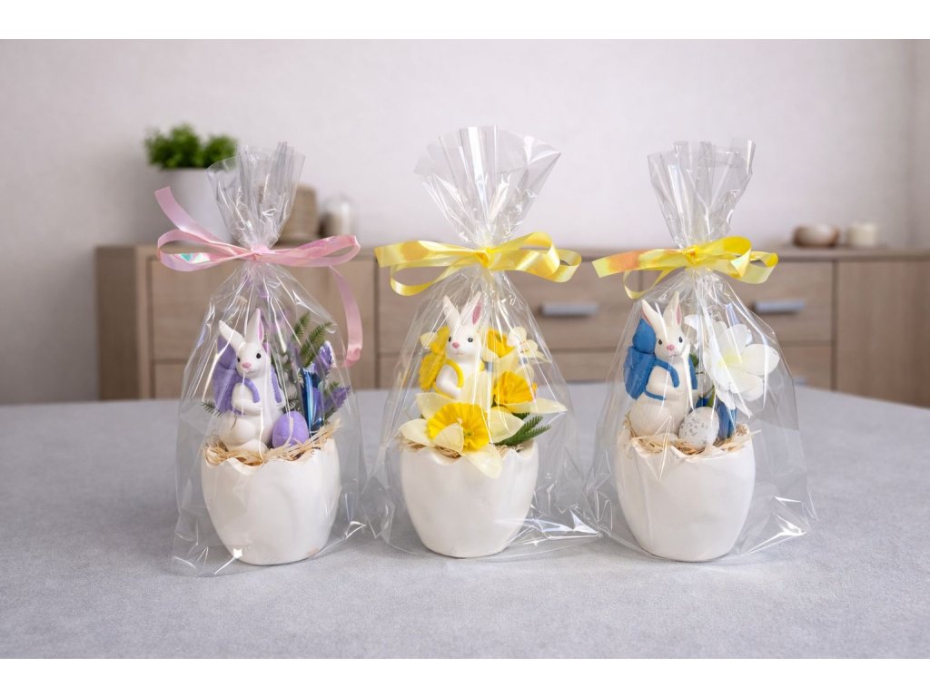 Celý set je pečlivě zabalen do průhledného celofánu a převázán žlutou saténovou stuhou, takže je připraven ihned k darování. Skvěle se hodí jako ozdoba na sváteční stůl, komodu či parapet nebo jako milý velikonoční dárek pro rodinu, přátele či kolegy.